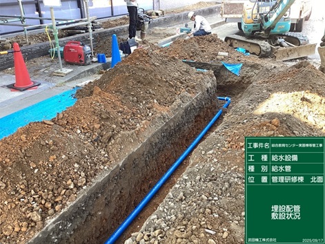 工事内容 | 総合教育センター実習棟、相談棟の新築工事に伴う管工事です。 衛生設備等を設置します。 工事中は近隣の皆様に騒音・振動等で何かとご迷惑をお掛けいたしますが、 ご理解・ご協力くださいますようお願い申し上げます。 |