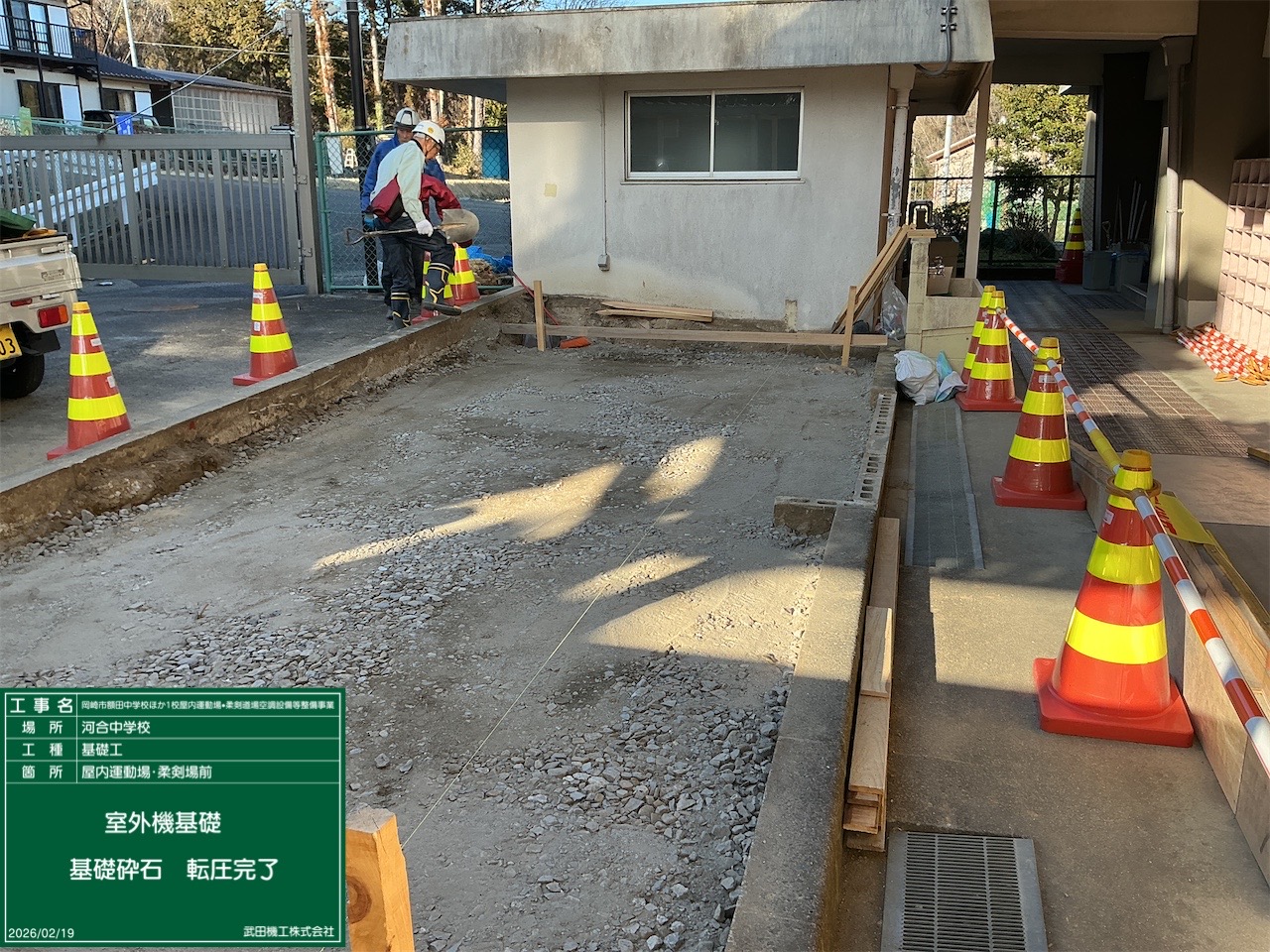 【内 容】 基礎工 屋外基礎 基礎砕石転圧完了 |